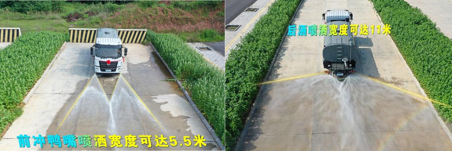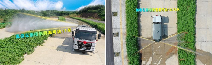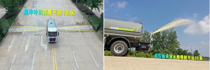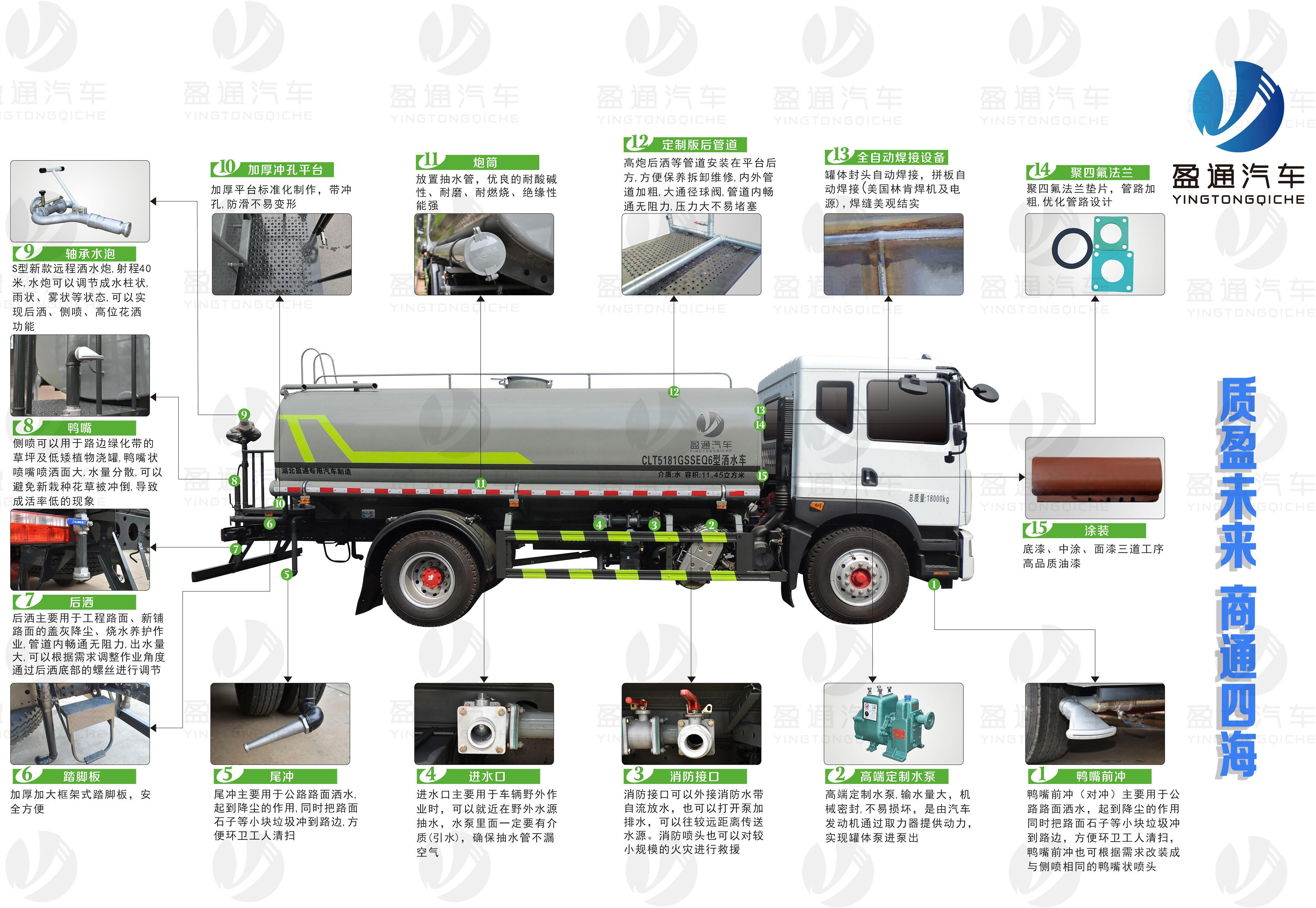 我公司產(chǎn)品標(biāo)配前噴(鴨嘴)、后沖、后灑、側(cè)噴、后置式工作平臺(tái),平臺(tái)上配置綠化水炮(可 360°旋轉(zhuǎn),既可以調(diào)成柱狀,也可以調(diào)成霧狀,更可以調(diào)成直沖狀、大雨、中雨、小雨、毛毛雨),配備優(yōu)質(zhì)大功率專用灑水泵(可自吸自排,可從河里或池塘抽水到罐體),取力器,雜物過(guò)濾網(wǎng),消防接口,自流球閥系統(tǒng)、取力器、球閥、濾網(wǎng)均為國(guó)家標(biāo)準(zhǔn)產(chǎn)品,主管道加粗,法蘭墊、法蘭盤加厚,大通徑球閥。整體具備性能優(yōu)良安全可靠、效率高、流量大、維修方便等特點(diǎn)。