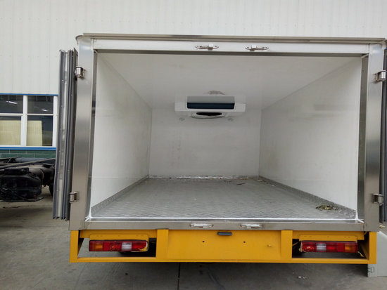 冷藏車廂體:采用國(guó)標(biāo)A級(jí)聚氨酯保溫材料,厚度為8厘米,廂體內(nèi)外采用玻璃鋼材質(zhì)全包裹。不銹鋼鎖件。包角、包邊鋁合金型材。底盤(pán)采用高強(qiáng)度花紋鋁板定制。可選裝肉鉤導(dǎo)軌,和底部通風(fēng)槽。廂體材質(zhì)為內(nèi)外玻璃鋼,中間夾層采用5個(gè)厚聚氨酯發(fā)泡隔熱材料,廂體一次成型,底板為花紋鋁板,門框邊飾全不銹鋼件,后門雙開(kāi)。