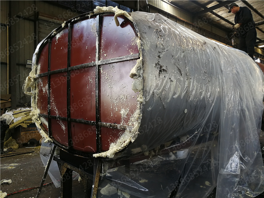 3. 保層溫的制作是在水罐外部另外焊接10mm厚的支撐骨架,然后用保溫材料將骨架內部填充滿,**在骨架外蒙上一層外皮。 保溫層外表鐵皮采用8mm厚高強度耐磨板,可選擇使用不銹鋼分鏡面8K或磨砂板