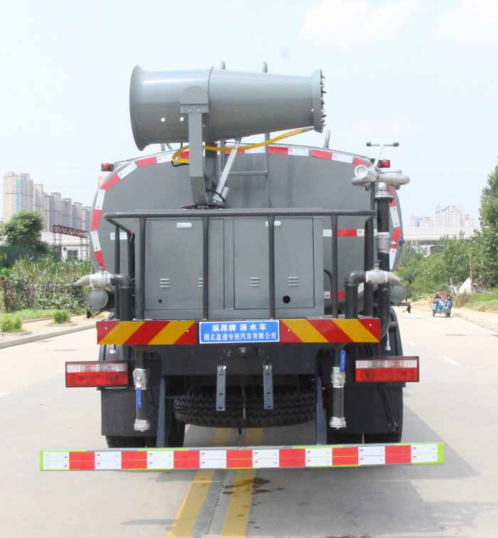 該車主要用于城鄉園林綠化噴灑作業;主要裝置為水罐及噴灑裝置;罐體總容量:10.7立方米;罐體有效容積:10.2立方米;罐體外形尺寸(×長軸×短軸)(mm):4800×2300×1300.ABS系統生產廠家,型號:焦作博瑞克控制技術有限公司,J ABS;襄陽東風隆誠機械有限責任公司,ABS/ASR-24V-4S/4M.側、后防護材料均為:Q235碳鋼,連接方式均為:螺栓連接,后部防護截面尺寸(mm):120×50,后部防護離地高度(mm):480.隨底盤選裝限速裝置,限速89km/h.隨底盤選裝燃油箱,電瓶,尿素罐,儲氣筒左右安裝位置,選裝噴霧裝置樣式.選裝箭頭燈裝置,選裝前部電子水炮裝置樣式,選裝前部不帶電子水炮;當前部帶電子水炮時,前伸500mm,整車長度為9100mm,8550mm;當前部不帶電子水炮時,前伸為0mm,整車長度為8600mm,8050mm.選裝罐體頂部高位花灑裝置及方形罐口,選裝尾部自流口裝置,選裝工具箱.采用底盤4500mm軸距改裝.后軸僅采用鋼板彈簧懸架.