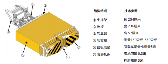 該防撞緩沖車上裝部分主要由貨箱總成、誘導組合燈、防撞緩沖模塊、液壓系統和電氣系統組成,通過油路控制防撞緩沖模塊升降,工作狀態下防撞模塊處于降落水平狀態。